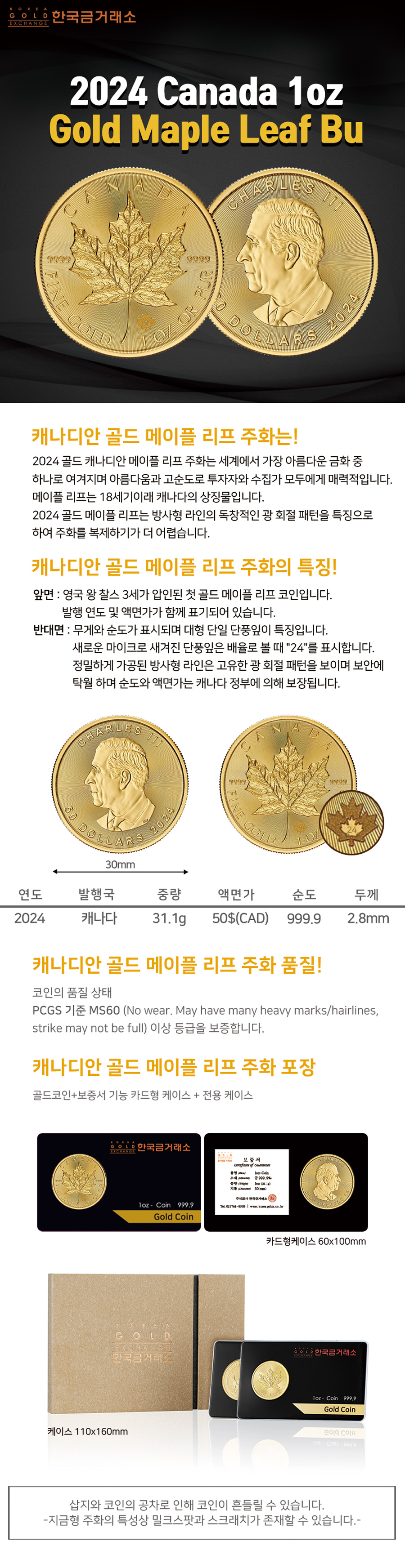 2024 1온스 골드 메이플 리프 불리온 주화(Coin) 50$(CAD)